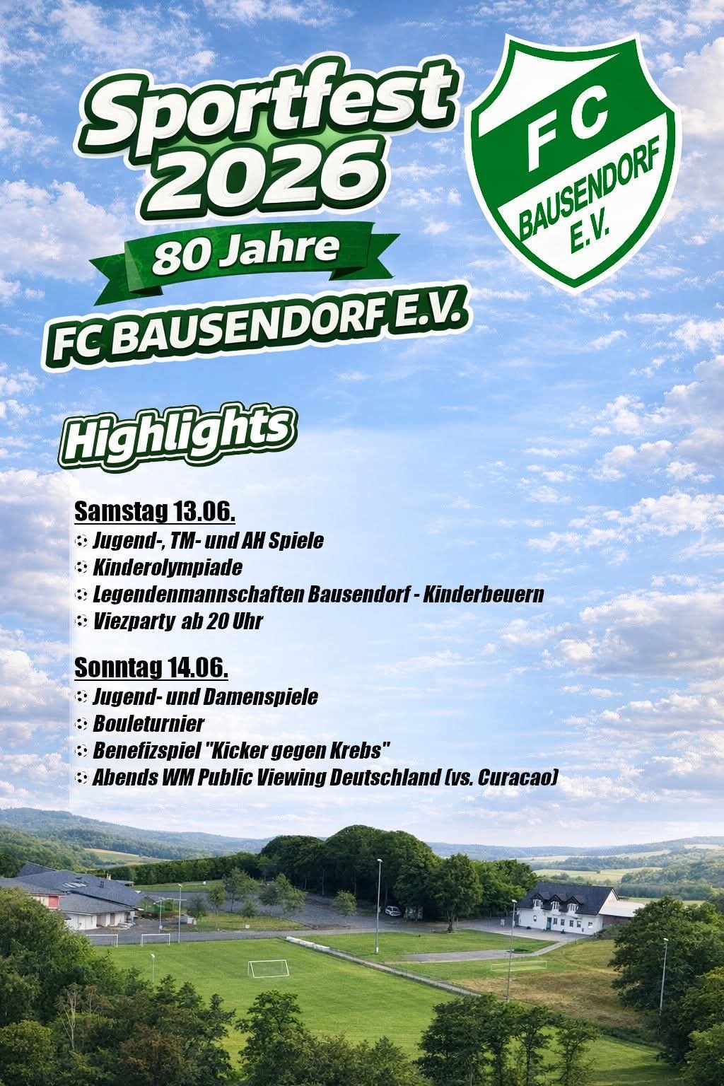 Sportplatz BausendorfIn den Osterferien gibt es an vier Tagen Fußball und Spaß für Mädchen und Jungen im Alter von 6 bis 12 Jahren. Die Teilnahme am Camp kostet pro Kind 130 Euro bzw. für jedes weitere Geschwisterkind 110 Euro. Mehr Infos und die Möglichkeit zur Anmeldung gibt es unter diesem Link Fußball-Camp in Bausendorf